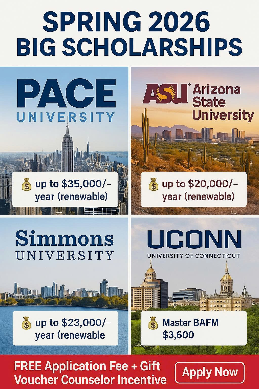 - Arizona State University (Phoenix) – up to $20,000/năm (renewable)
